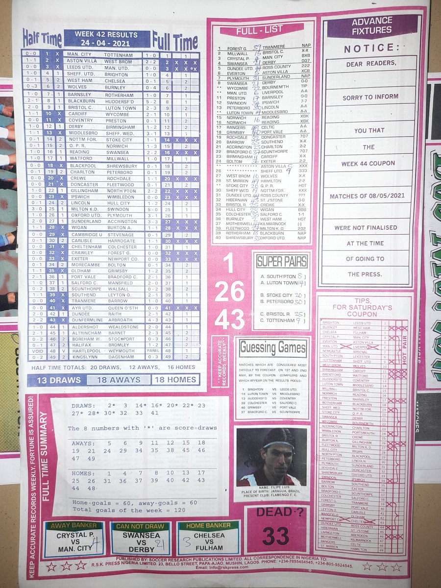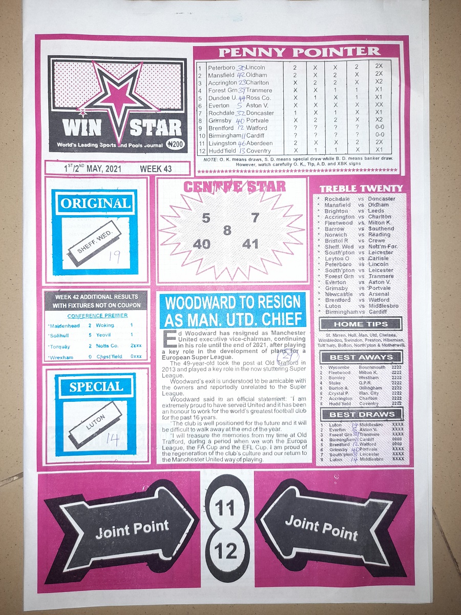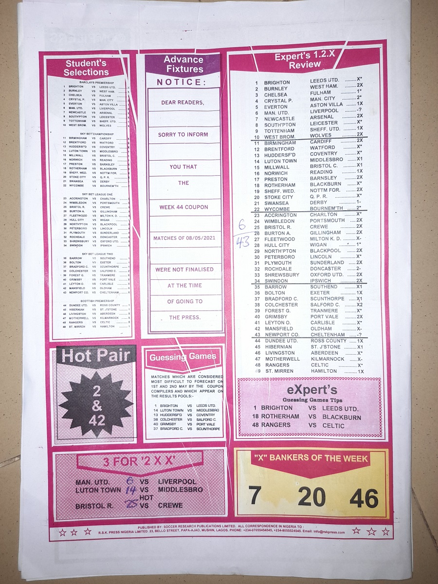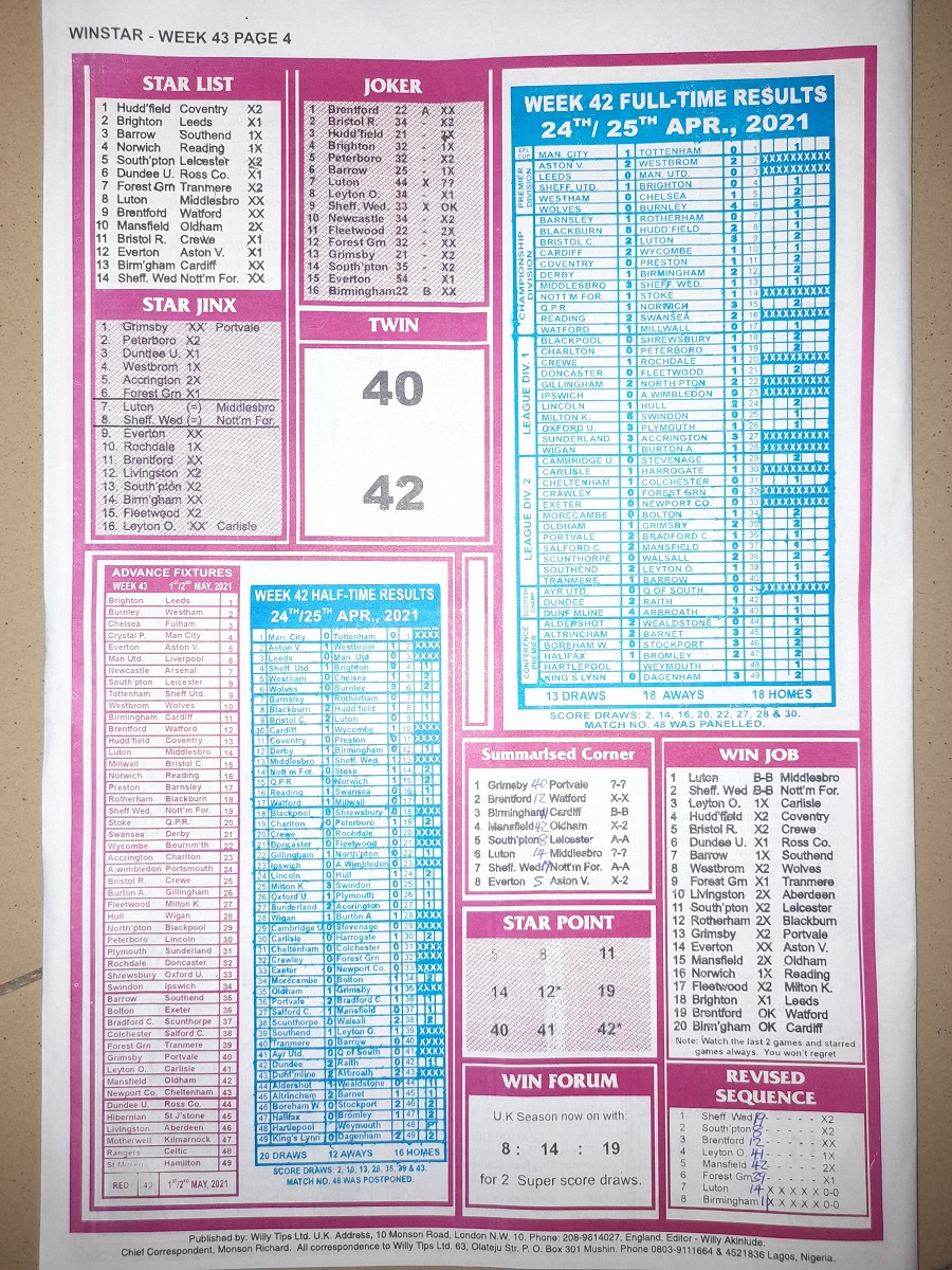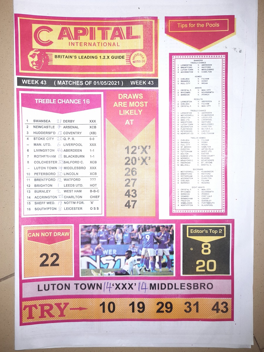 Here we provide you with the best football pools papers such as Bob Morton, Capital International, and Soccer ‘X’ Research, we publish the world’s leading football pools forecasting papers apart from RSK in the likes of WinStar, BigWin, Dream International Research, Weekly 1.X.2 Matrix, and pools fixtures like Special Advance Fixtures, Fight On Football Fixtures, Banky Fixtures and Fortune Advance Fixtures.