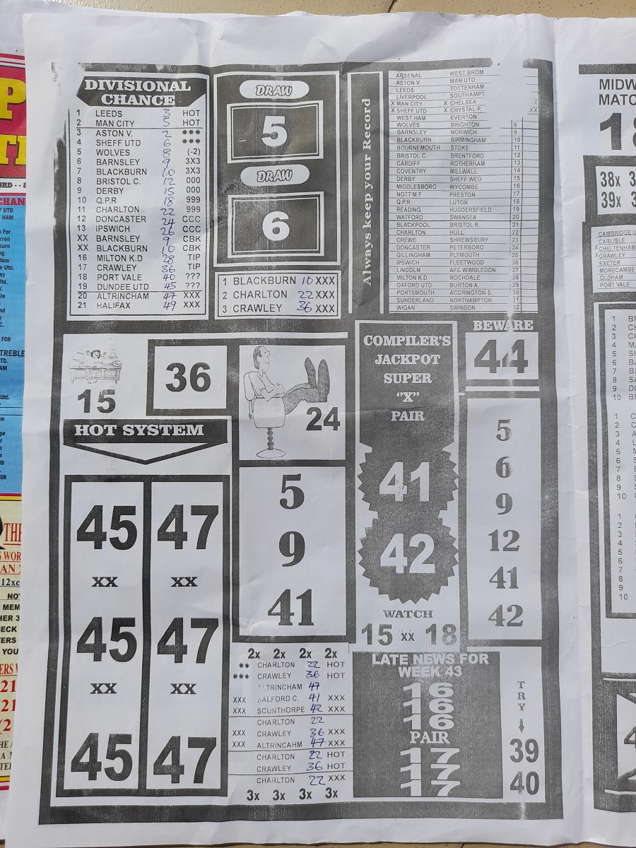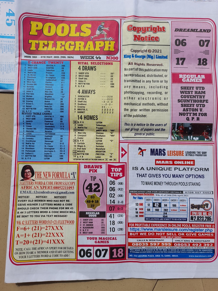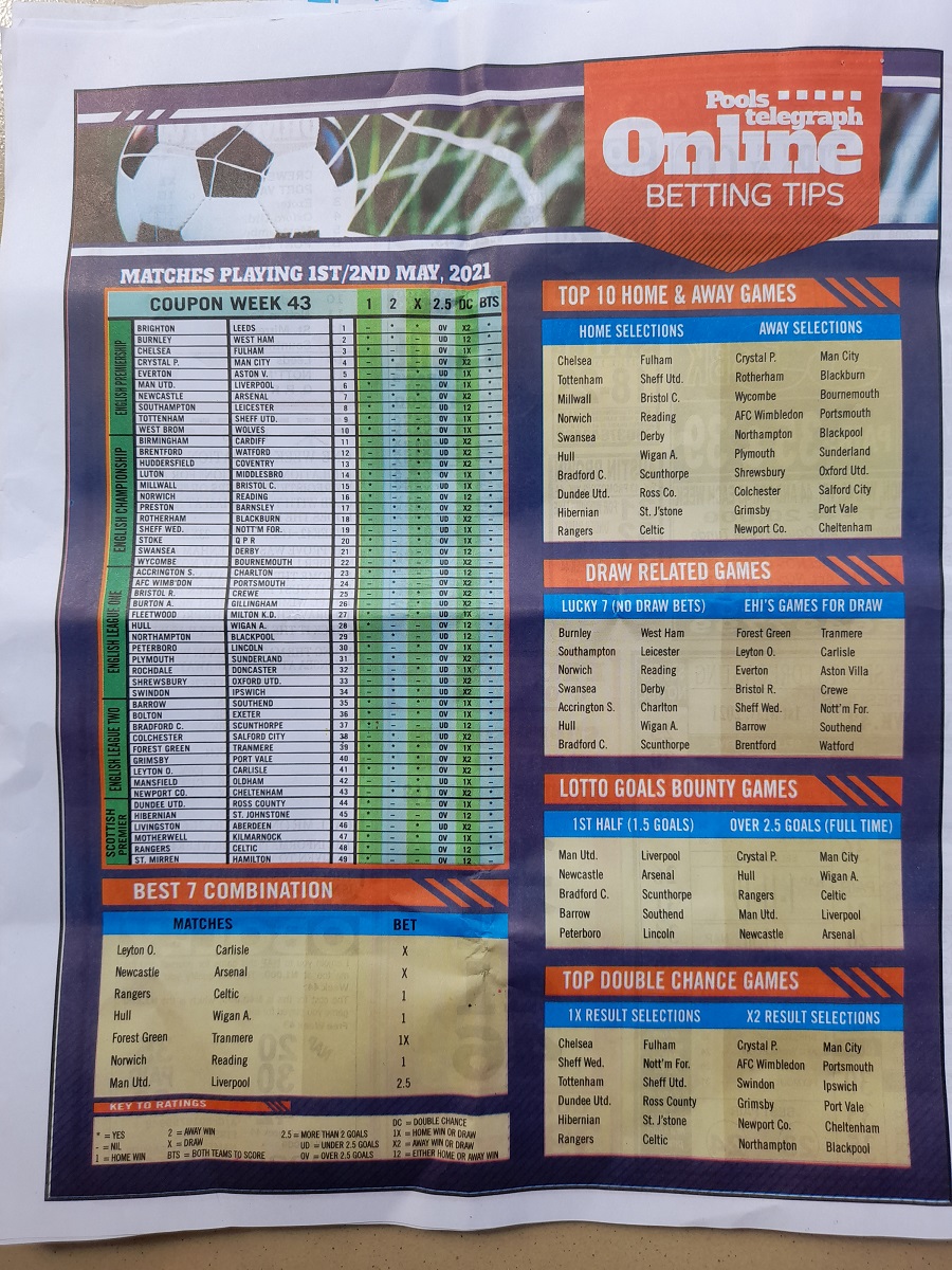 Welcome to this week late news pool papers. Here we provide you with papers such as: Bigwin Soccer, Pools Telegraph, Dream International Research, Dream Pools News, Sporting Informant and many others pools journal, also do remember that we furnish you with up-to-date football pools papers, rsk papers, late news papers, weekly telegraph, and now the pools telegraph pools late news which is to easy your forecasting needs.