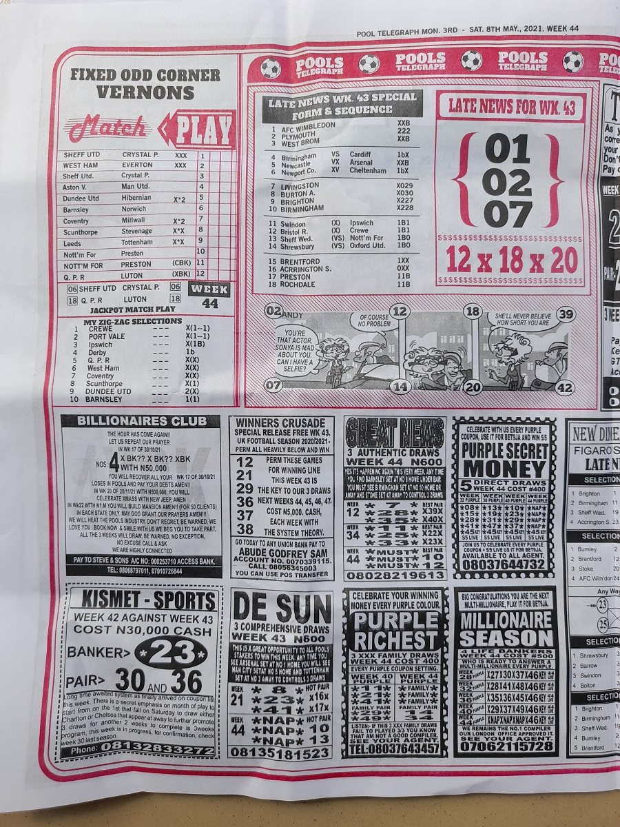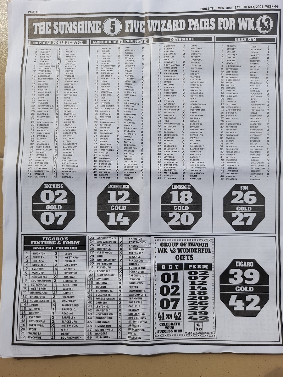 Week 44 Pools Late News Papers 2021