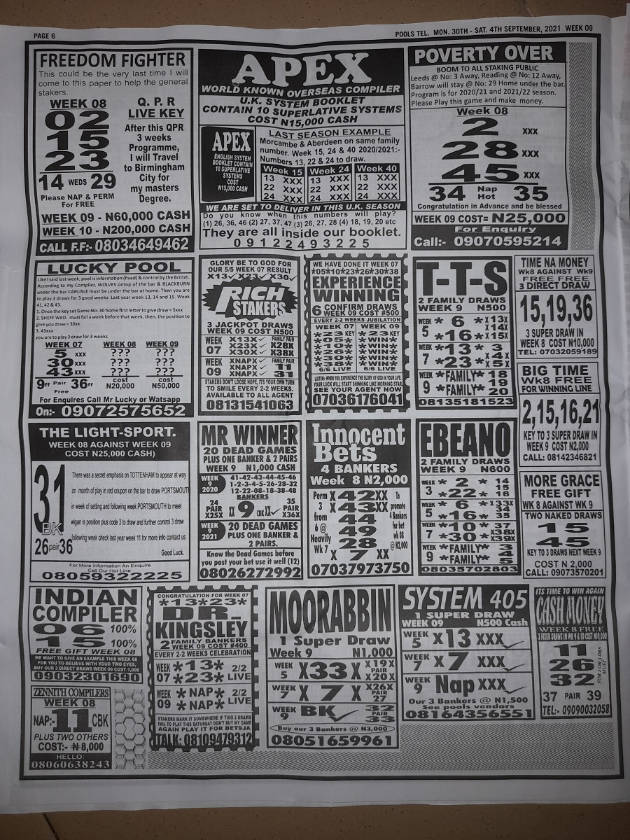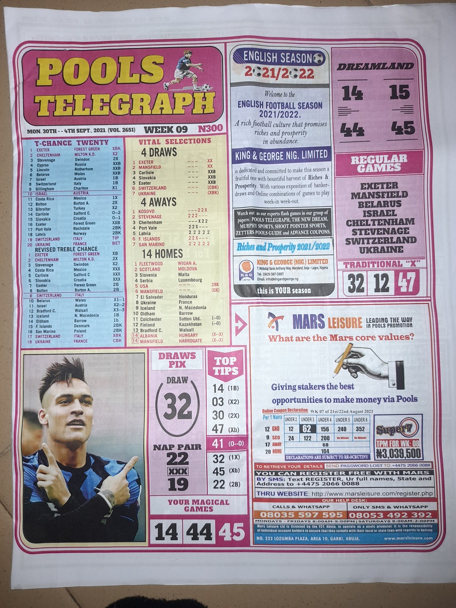 Welcome to this week late news pool papers. Here we provide you with papers such as: Bigwin Soccer, Pool Telegraph, Dream International Research, Dream Pool News, Sporting Informant and many others pools journal, also do remember that we furnish you with up-to-date football pools papers, rsk papers, late news papers, weekly telegraph, and now the pool telegraph pool late news which is to easy your forecasting needs.