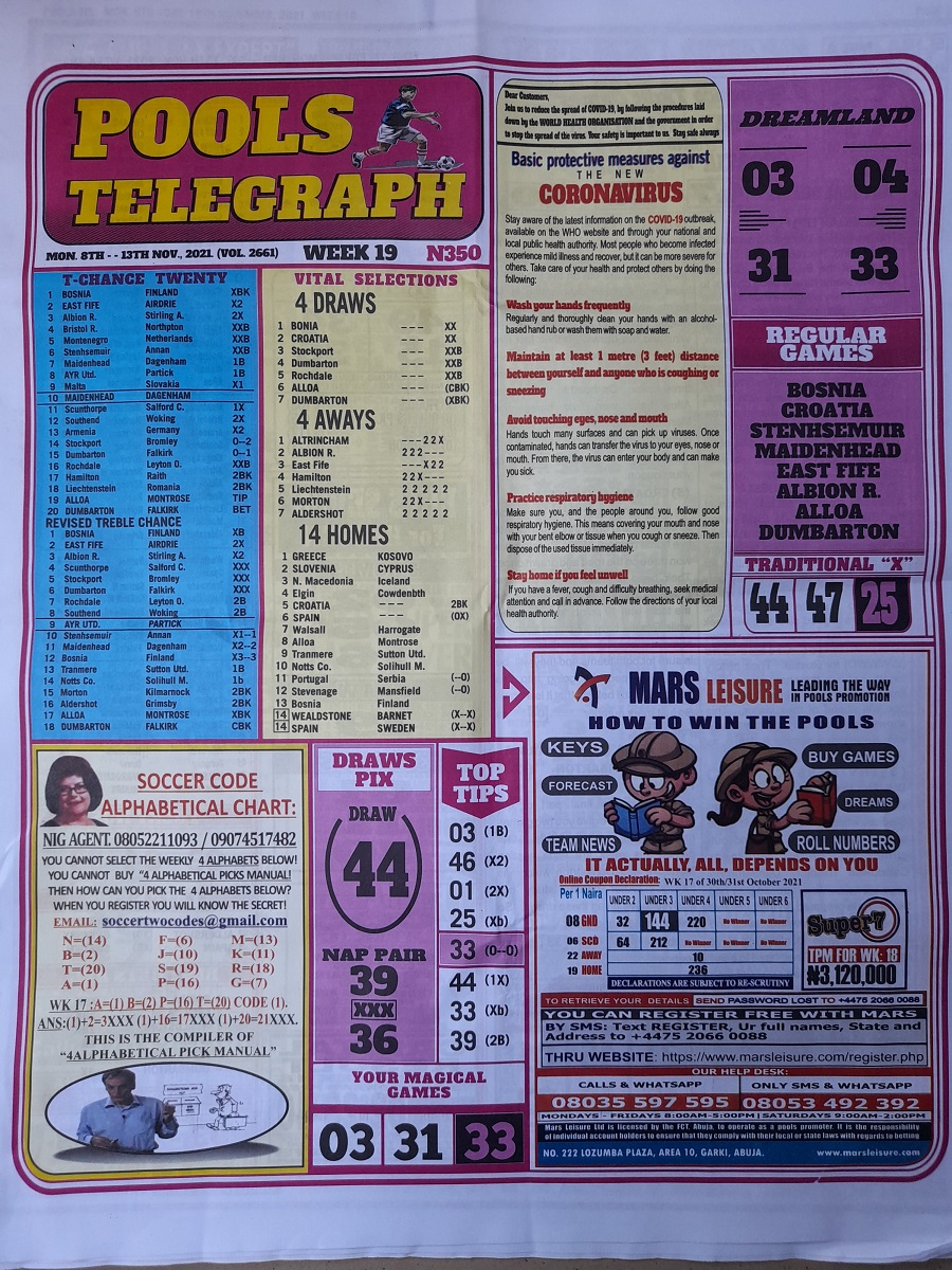 Welcome to this week late news pool papers. Here we provide you with papers such as: Bigwin Soccer, Pool Telegraph, Dream International Research, Dream Pool News, Sporting Informant and many others pools journal, also do remember that we furnish you with up-to-date football pools papers, rsk papers, late news papers, weekly telegraph, and now the pool telegraph pool late news which is to easy your forecasting needs.