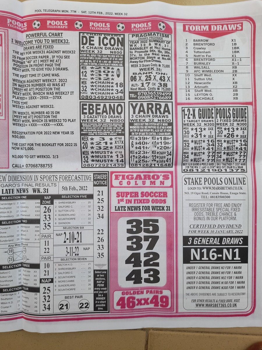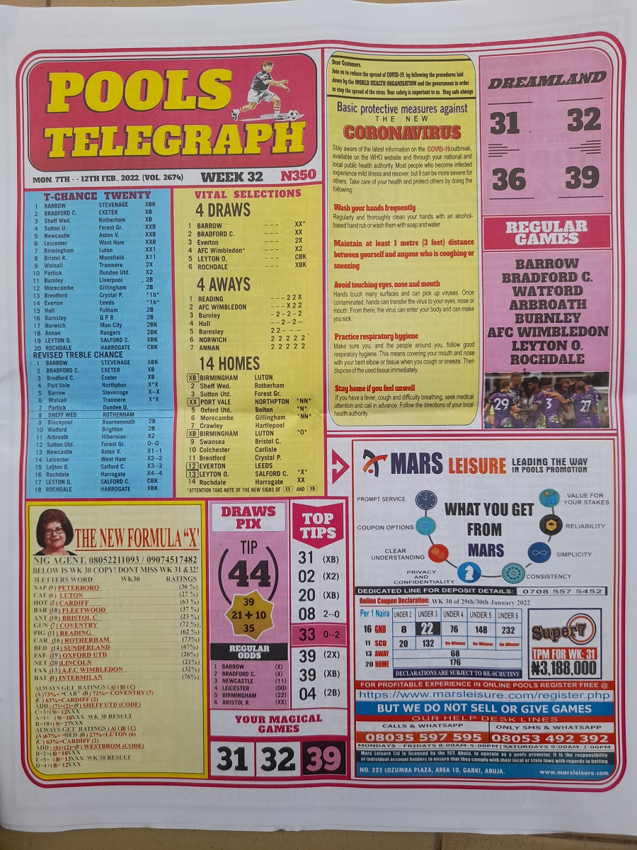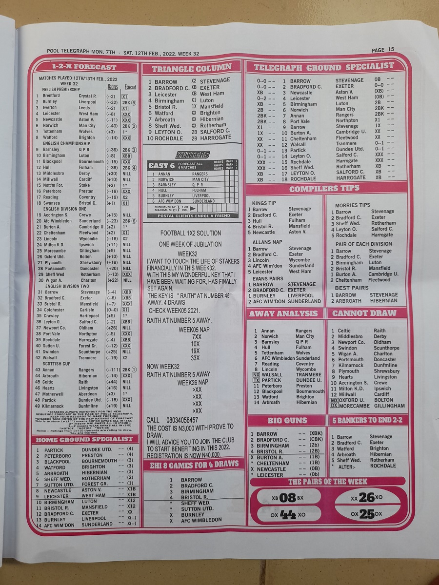 Week 32 pool telegraph 2022, Week 32 bigwin soccer 2022, Week 32 soccer standard 2022, Week 32 pool telegraph late news 2022, Week 32 bigwin soccer pool late news 2022