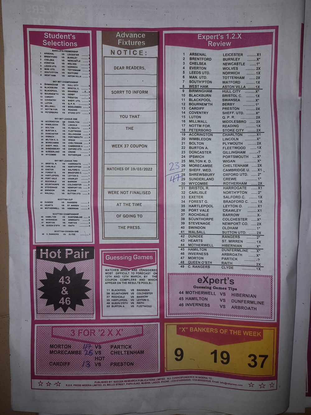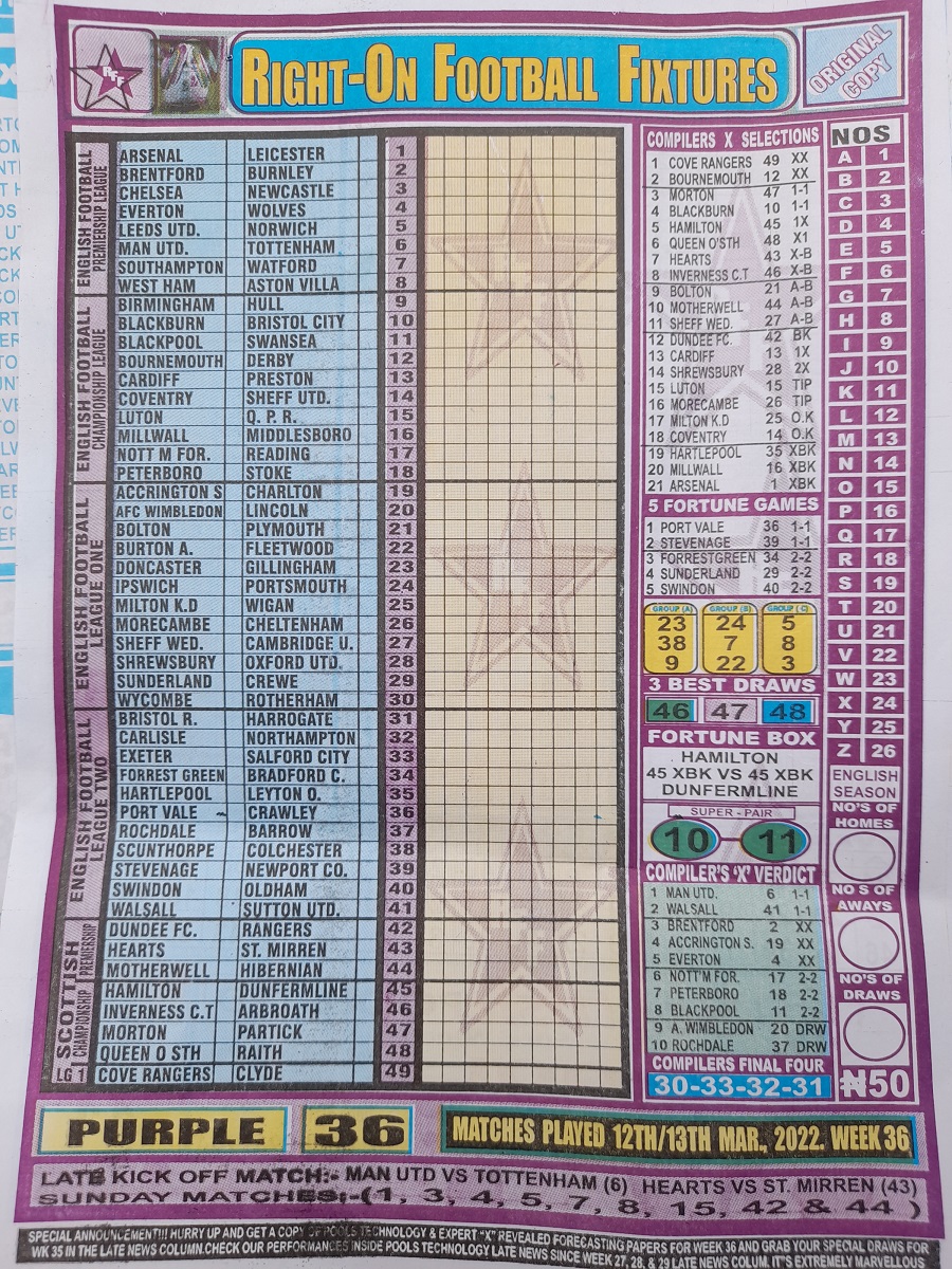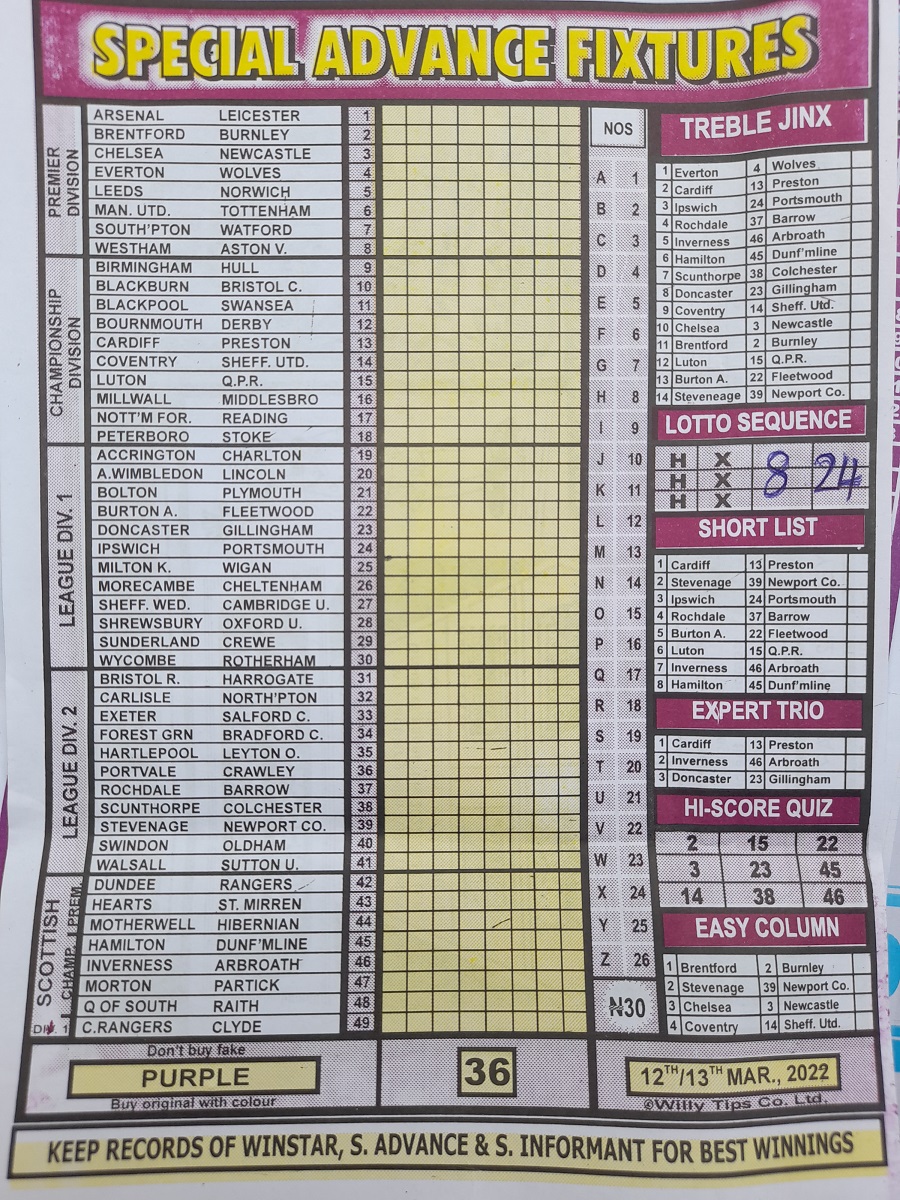 Here we provide you with the best football papers such as Bob Morton, Capital International, and Soccer ‘X’ Research, we publish the world’s leading weekend football forecasting papers apart from RSK in the likes of WinStar, BigWin, Dream International Research, Weekly 1.X.2 Matrix, and pools fixtures like Special Advance Fixtures, Fight On Football Fixtures, Banky Fixtures and Fortune Advance Fixtures.