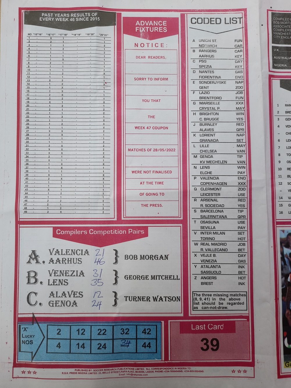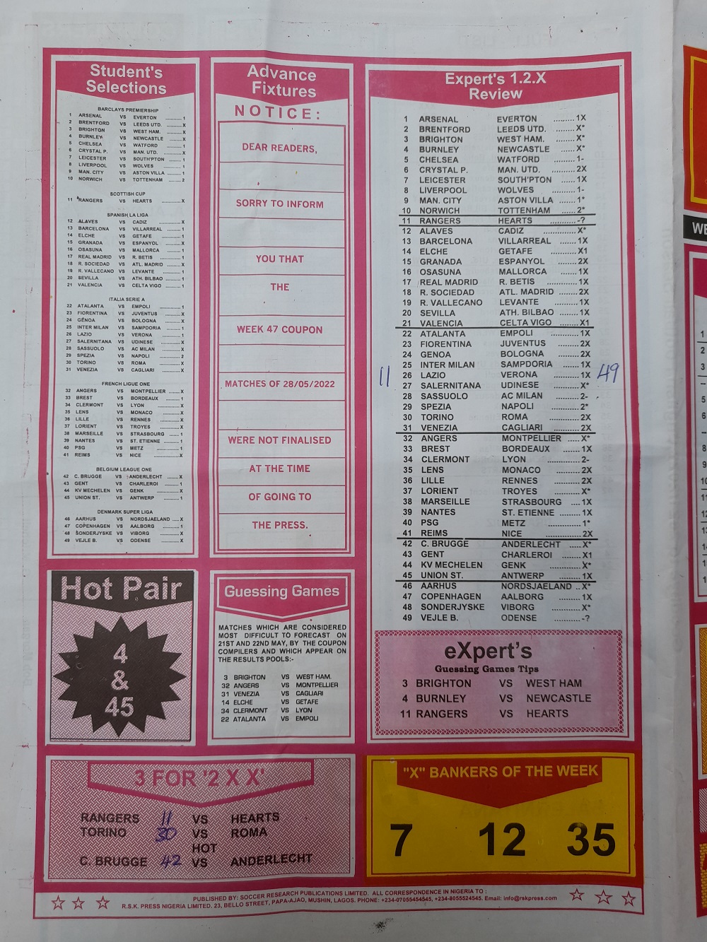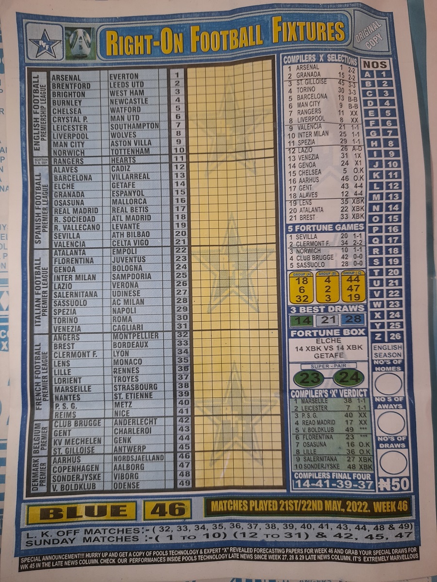 Week 46 rsk papers 2022: Here we provide you with the best football papers such as Bob Morton, Capital International, and Soccer ‘X’ Research, we publish the world’s leading weekend football forecasting papers apart from RSK in the likes of WinStar, BigWin, Dream International Research, Weekly 1.X.2 Matrix, and pools fixtures like Special Advance Fixtures, Fight On Football Fixtures, Banky Fixtures and Fortune Advance Fixtures.