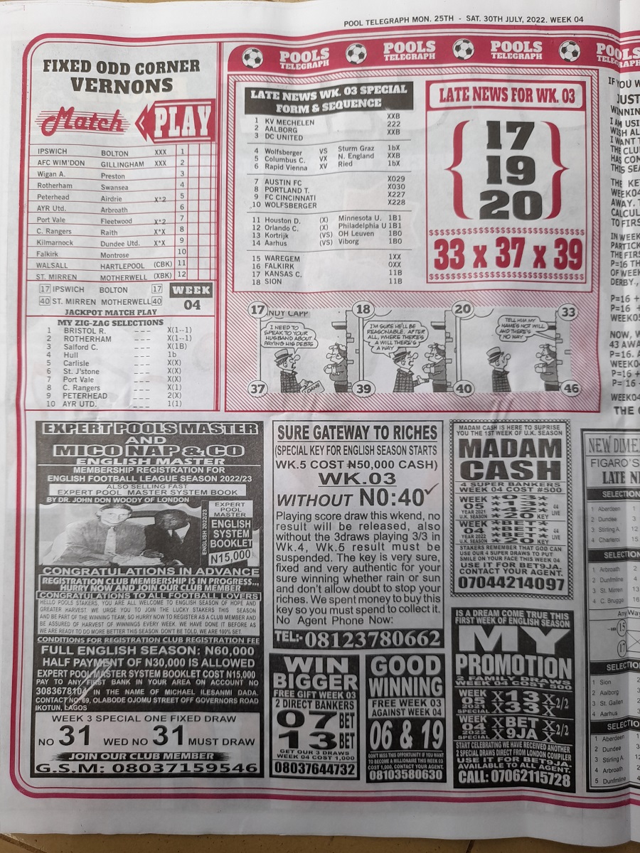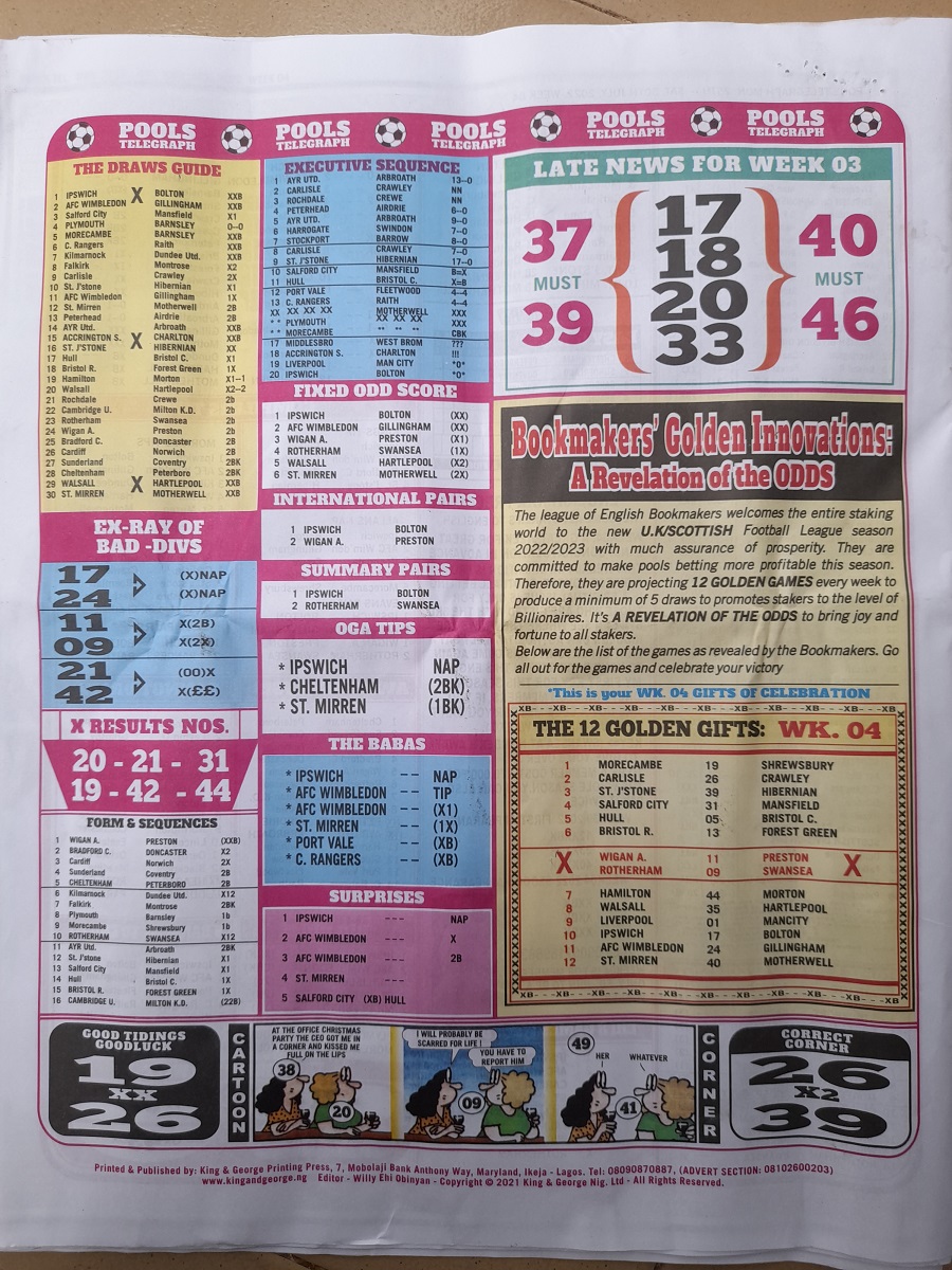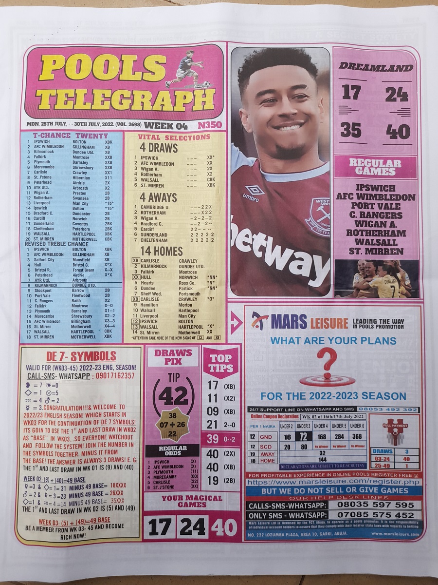 Welcome to this week late news pool papers. Here we provide you with papers such as: Bigwin Soccer, Pool Telegraph, Dream International Research, Dream Pool News, Sporting Informant and many others pools journal, also do remember that we furnish you with up-to-date football pools papers, rsk papers, late news papers, weekly telegraph, and now the pool telegraph pool late news which is to easy your forecasting needs.