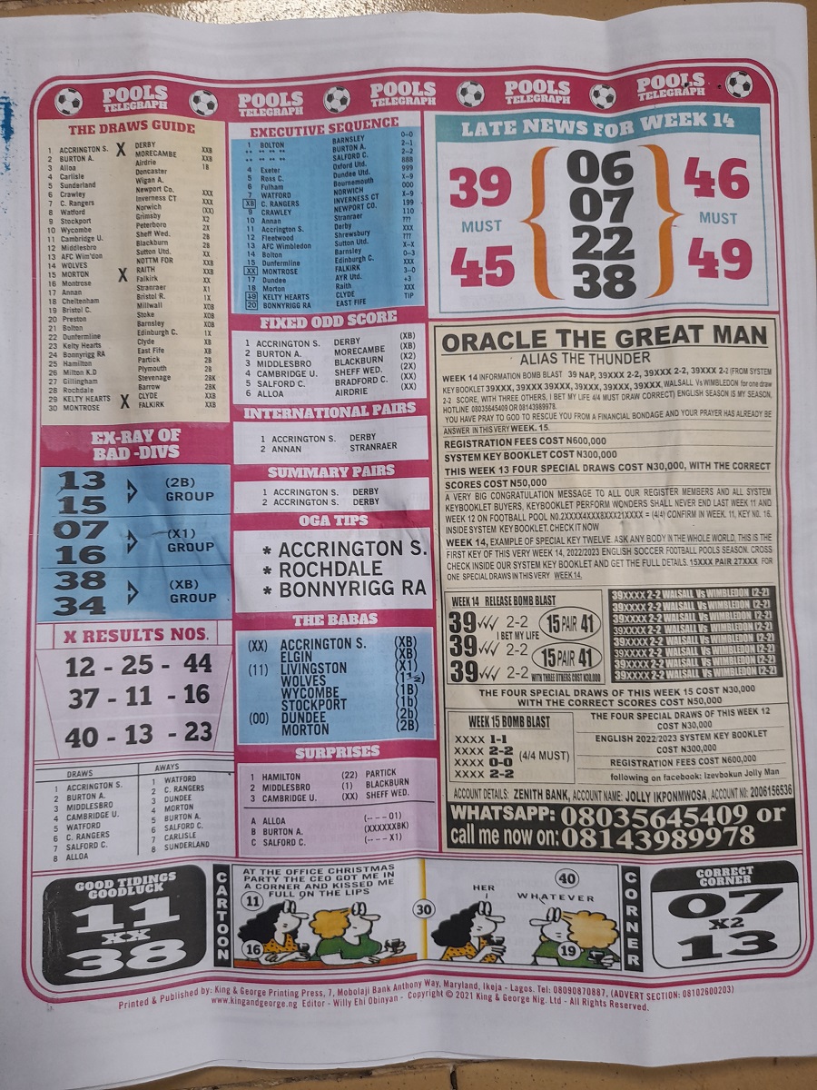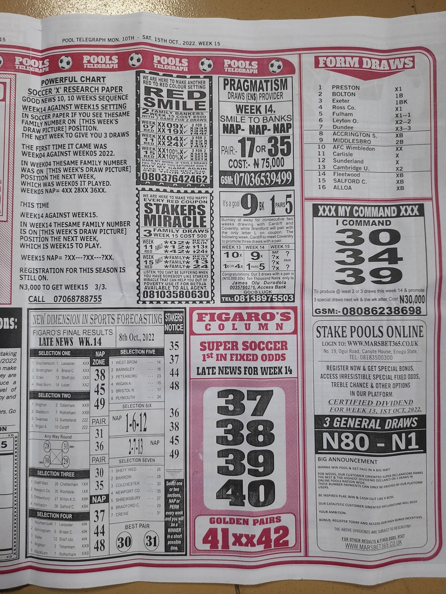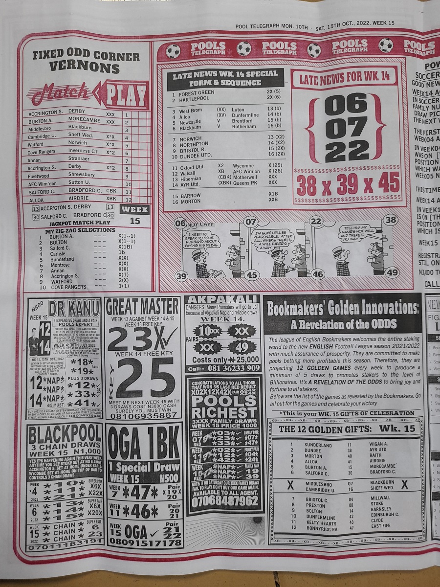 Week 15 late news paper 2022: Welcome to this week late news pool papers. Here we provide you with papers such as: Bigwin Soccer, Pool Telegraph, Dream International Research, Dream Pool News, Sporting Informant and many others pools journal, also do remember that we furnish you with up-to-date football pools papers, rsk papers, late news papers, weekly telegraph, and now the pool telegraph pool late news which is to easy your forecasting needs.