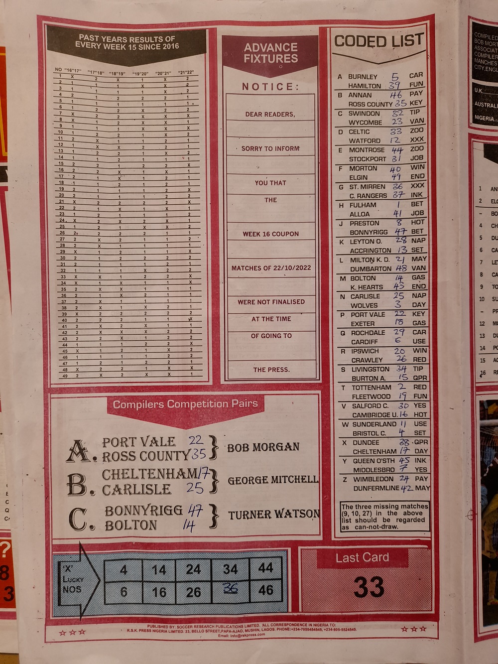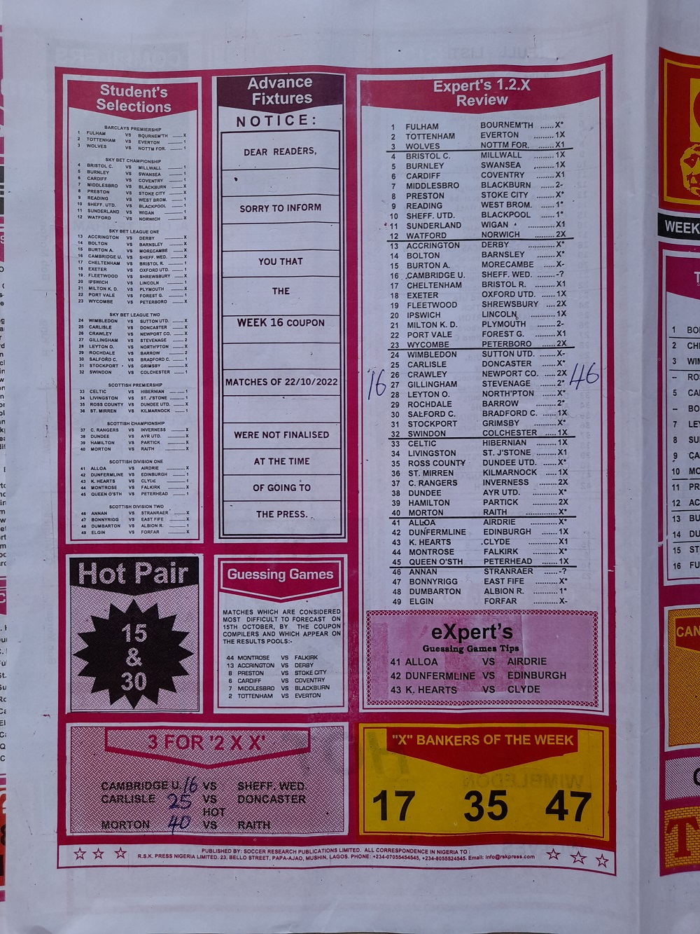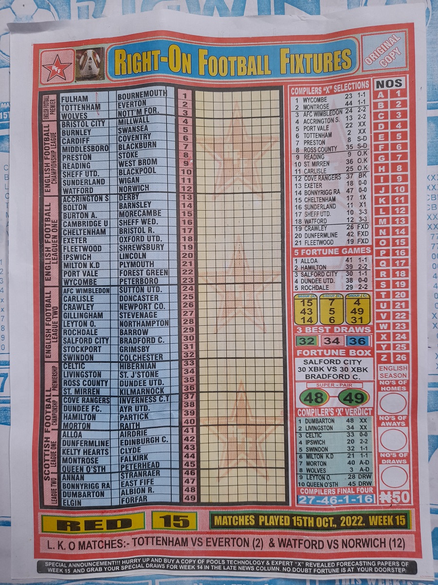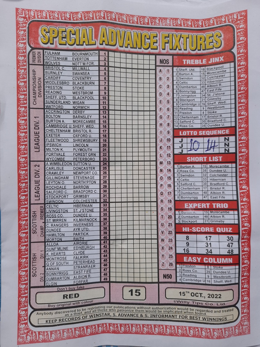 Week 15 rsk papers 2022: Here we provide you with the best football papers such as Bob Morton, Capital International, and Soccer ‘X’ Research, we publish the world’s leading weekend football forecasting papers apart from RSK in the likes of WinStar, BigWin, Dream International Research, Weekly 1.X.2 Matrix, and pools fixtures like Special Advance Fixtures, Fight On Football Fixtures, Banky Fixtures and Fortune Advance Fixtures.