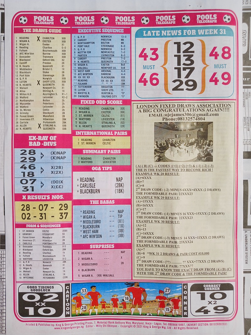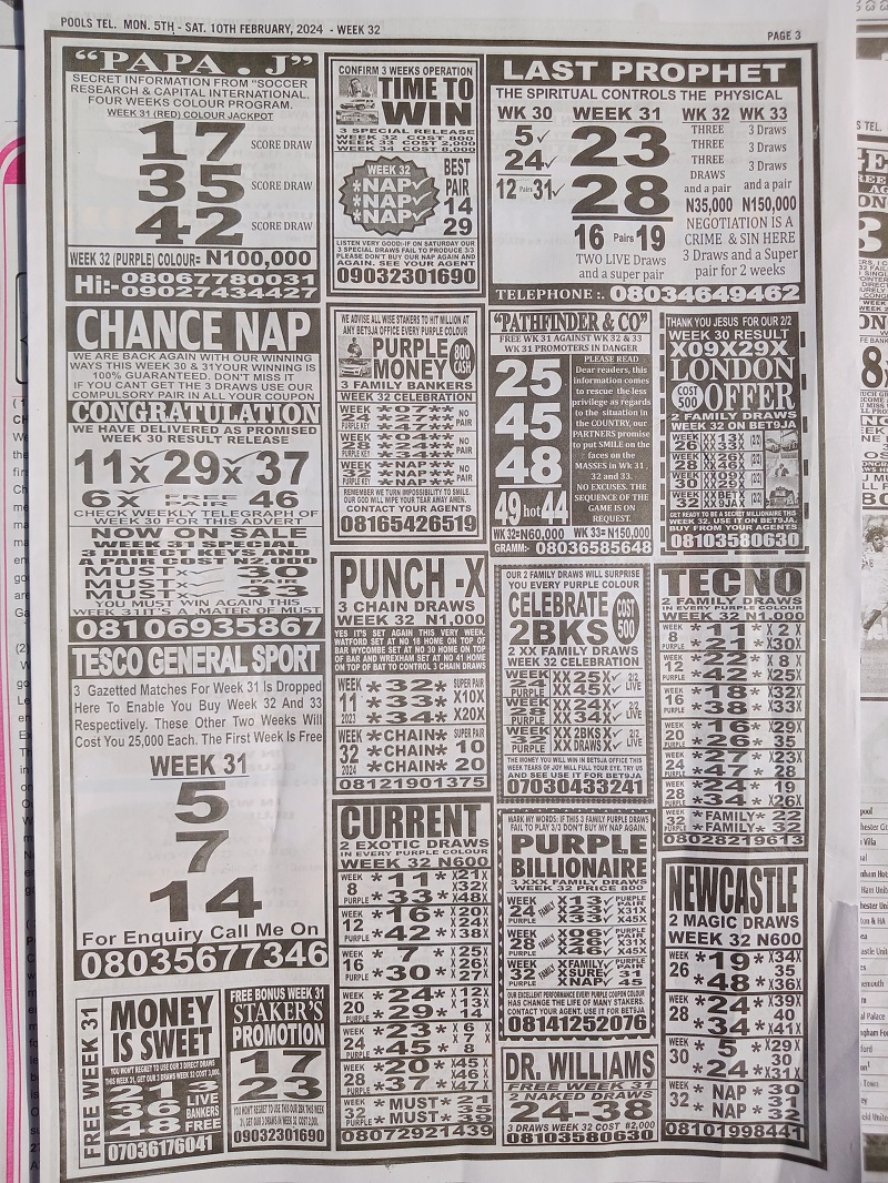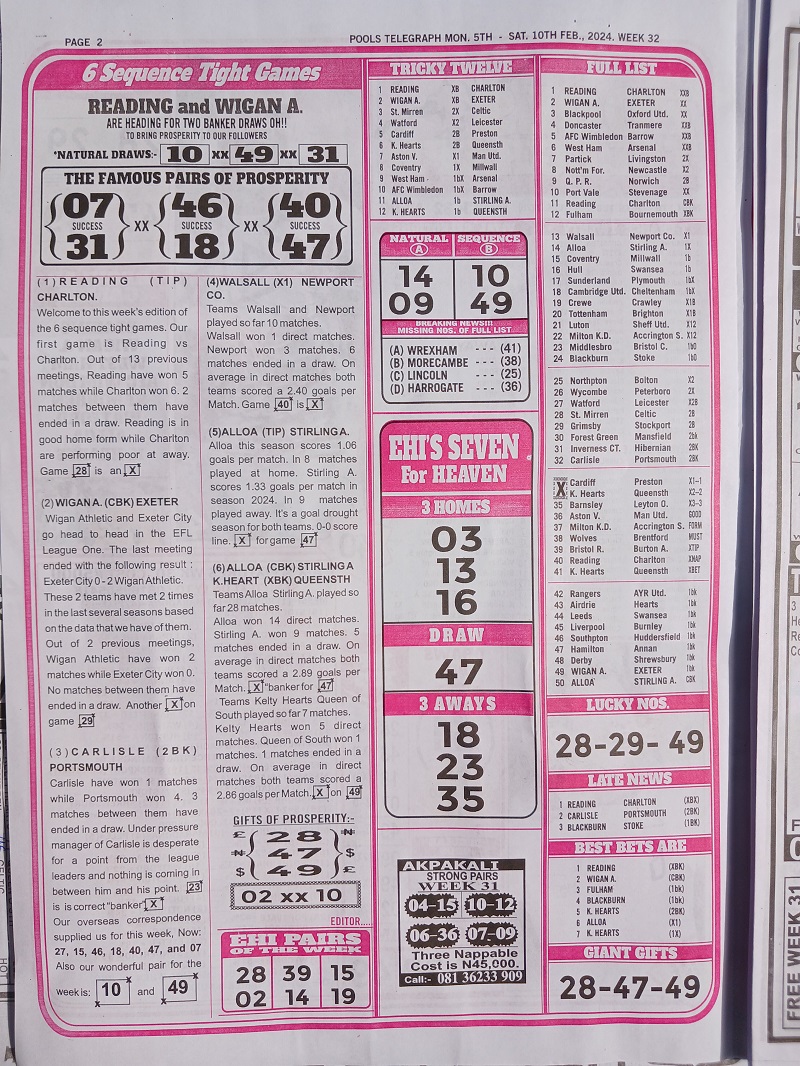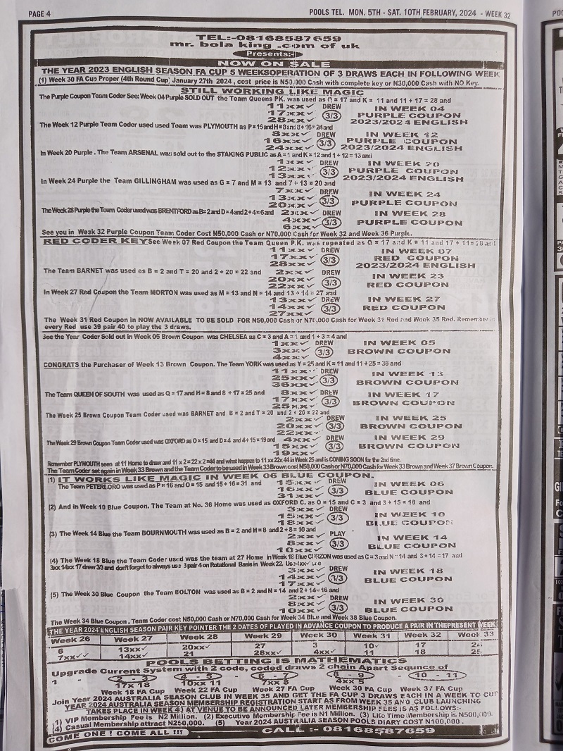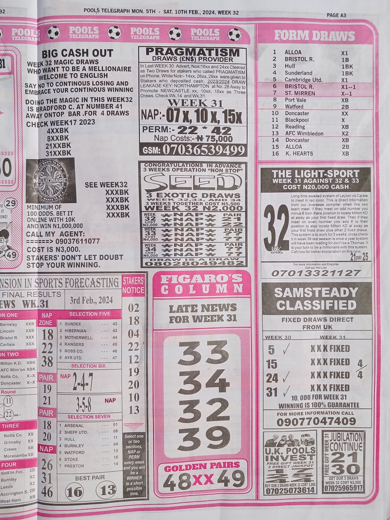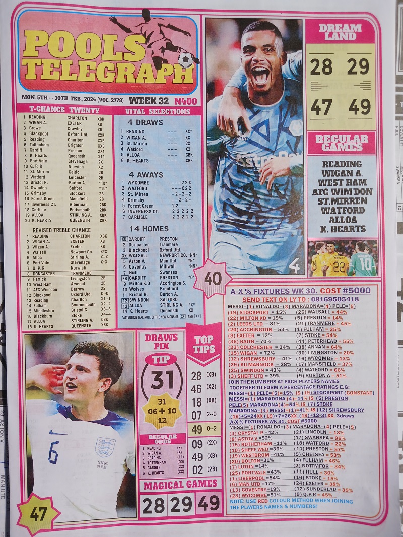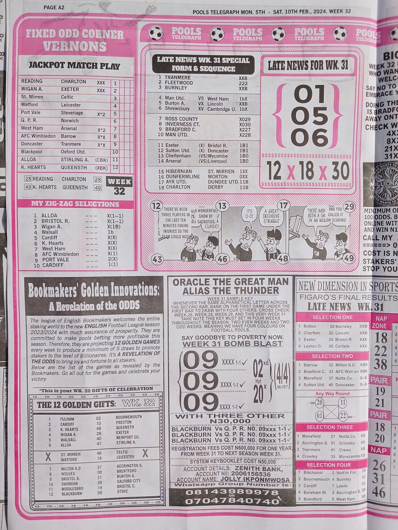 Week 32 Bigwin Soccer and Pools Telegraph Pool Late News Papers 2024