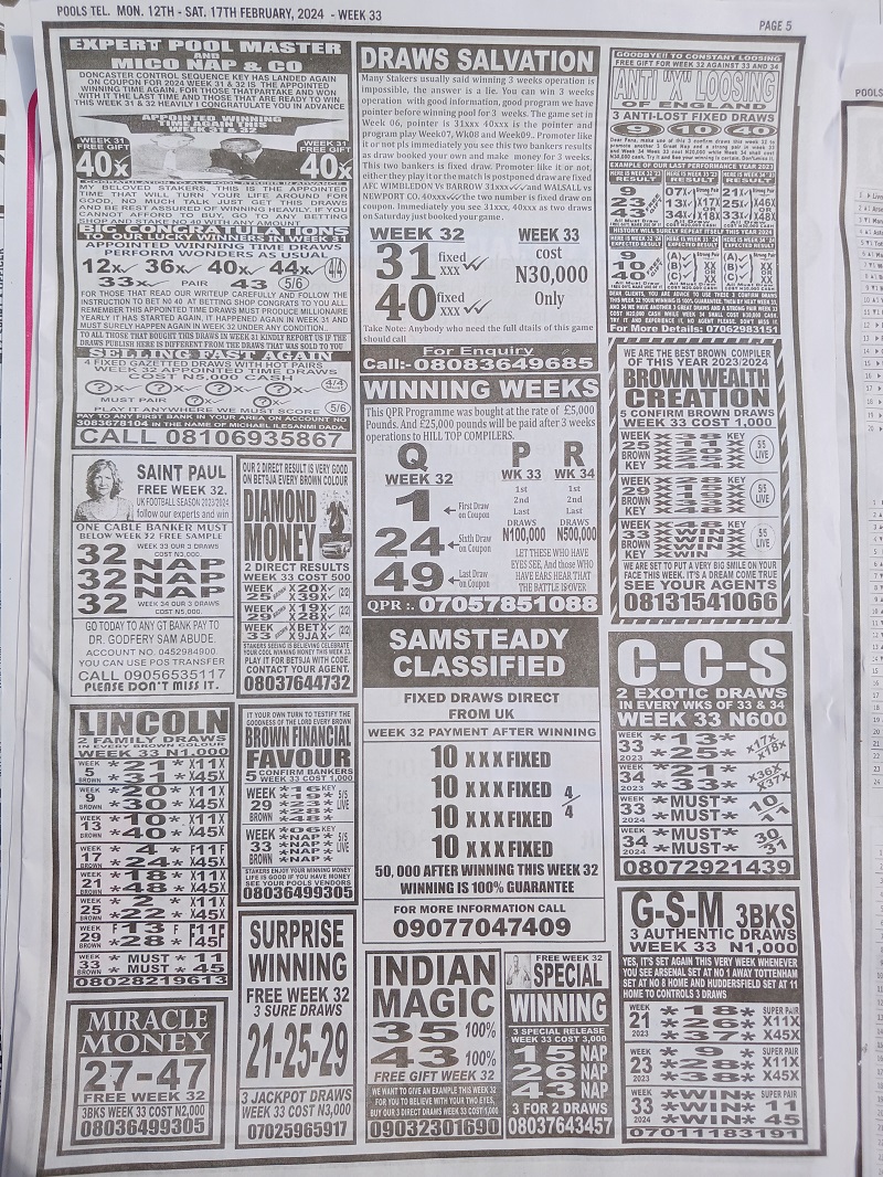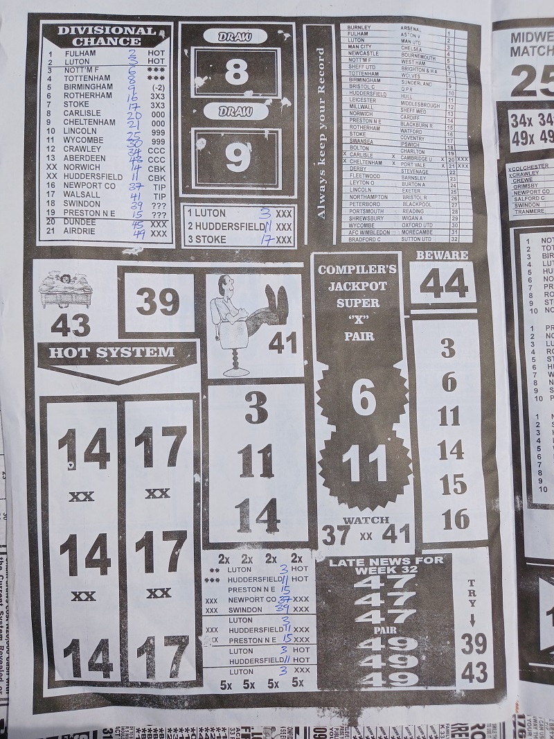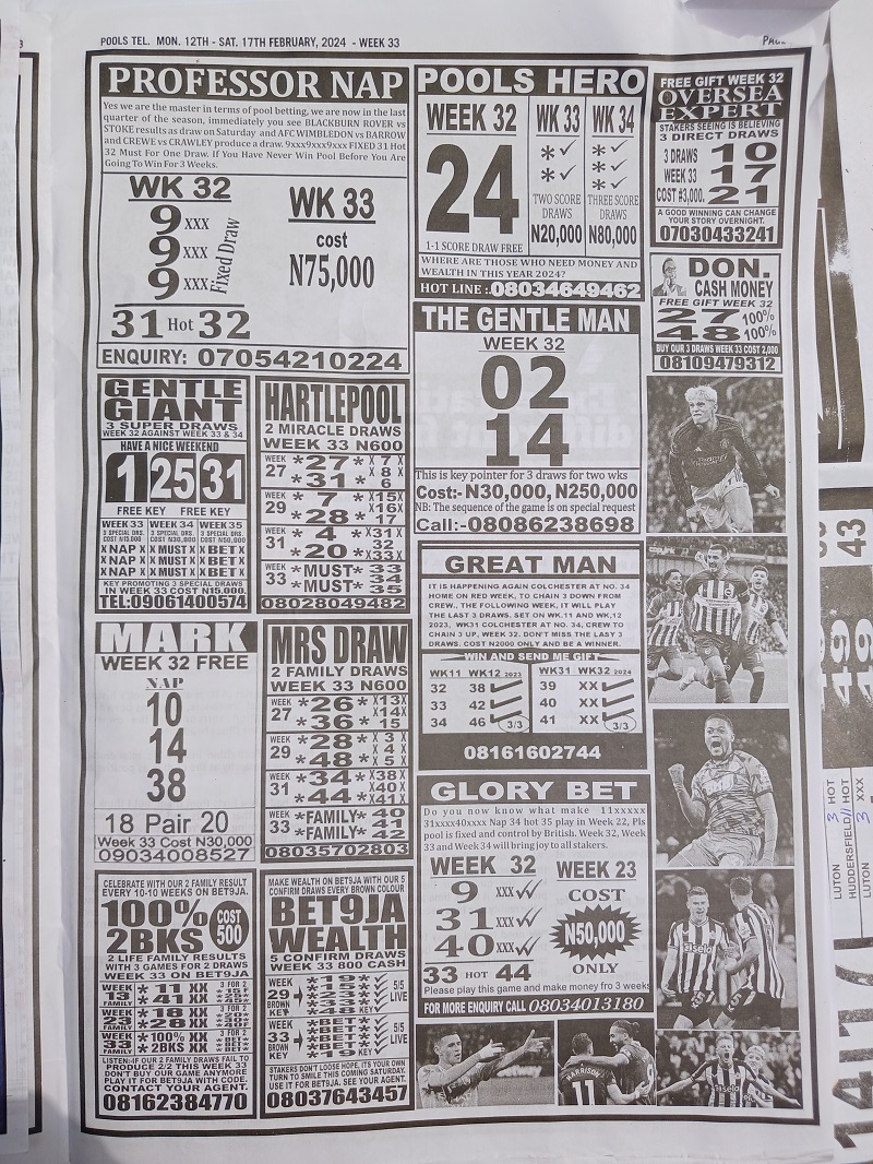 Week 33 late news papers 2024: Here we provide you with the best football pools papers such as Dream International Research (comes with Late News), Fortune ‘X’ Matrix, and Dream International Fixtures, we publish the world’s leading weekend football pools forecasting papers poised to boost your winning chances. Apart from CBK papers we also publish late news papers like Dream International Research and Bigwin Soccer.