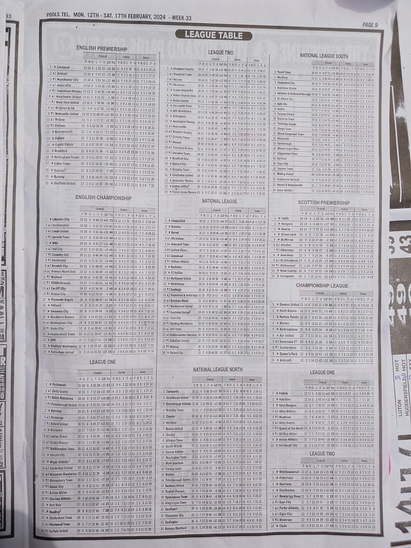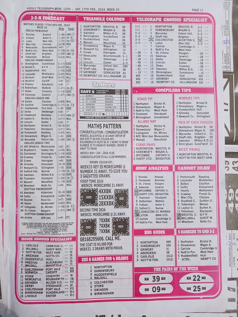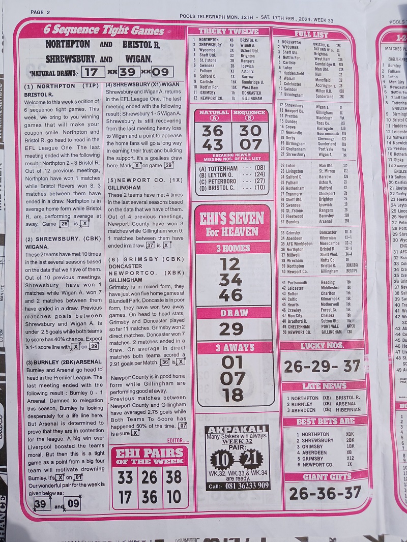 Week 33 Bigwin Soccer and Pools Telegraph Pool Late News Papers 2024