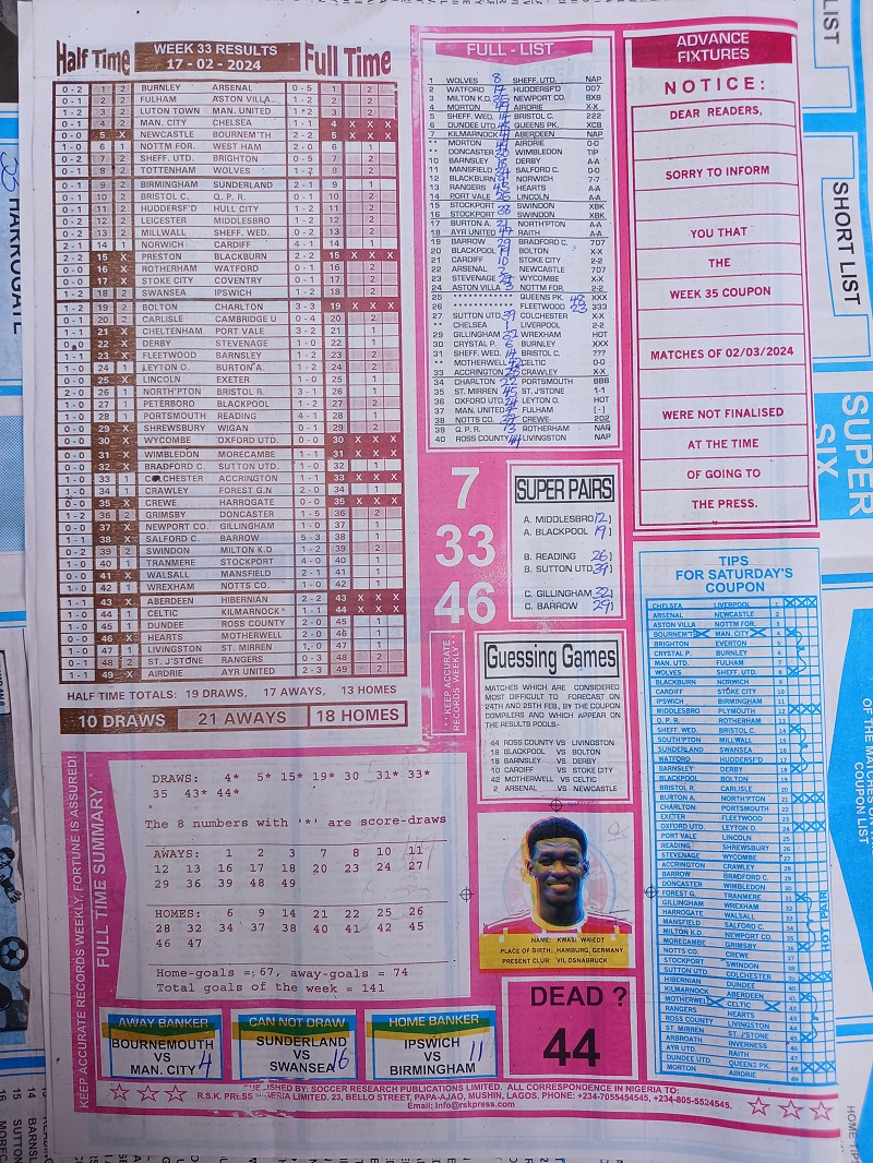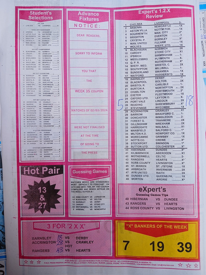 Week 34 rsk papers 2024: Here we provide you with the best football papers such as Bob Morton, Fortune ‘X’ Matrix, Capital International, Dream International Research, and Soccer ‘X’ Research, we publish the world’s leading weekend football forecasting papers apart from RSK in the likes of WinStar, BigWin, Dream International Research, Pools Telegraph, and pools fixtures like Dream Int’l Fixtures, Special Advance Fixtures, and Right On Football Fixtures.