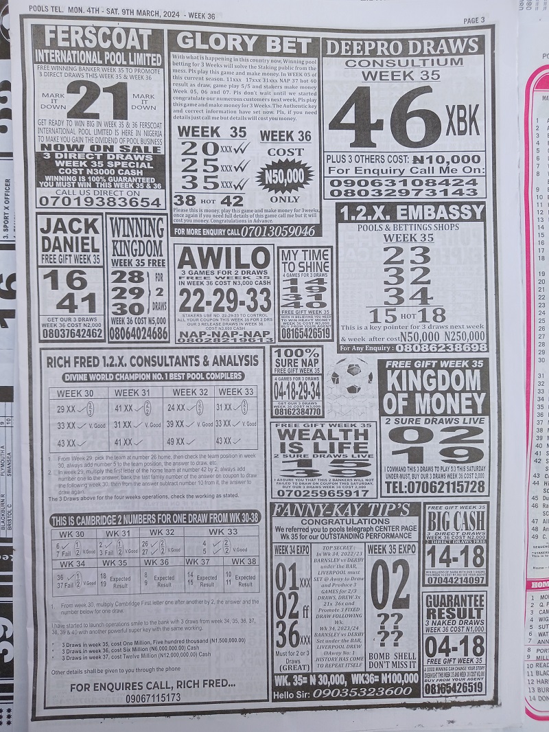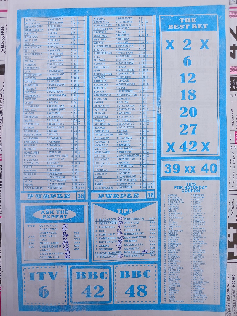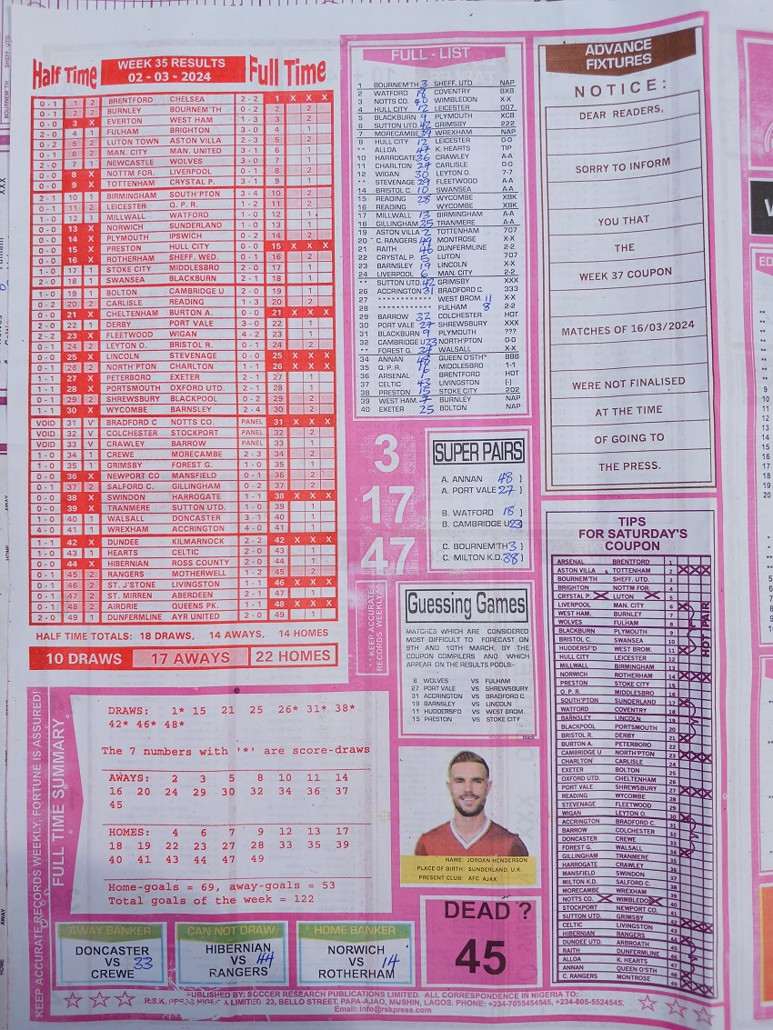 Week 36 rsk papers 2024: Here we provide you with the best football papers such as Bob Morton, Fortune ‘X’ Matrix, Capital International, Dream International Research, and Soccer ‘X’ Research, we publish the world’s leading weekend football forecasting papers apart from RSK in the likes of WinStar, BigWin, Dream International Research, Pools Telegraph, and pools fixtures like Dream Int’l Fixtures, Special Advance Fixtures, and Right On Football Fixtures.